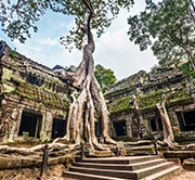 Although very similar to Ta Prohm, the vast complex of Preah Kahnis often overlooked, which is a mistake in our opinion as it is equally entrancing, yet much less crowded. One of the largest structures in the Angkor Kingdom, in its heyday Preah Kahn served as a home to 100,000 officials and servants. In similarity to Ta Prohm, nature has really taken over here and corridors warp and twist under the weight of the gigantic trees that have fused with fascinating effect to the ancient walls.